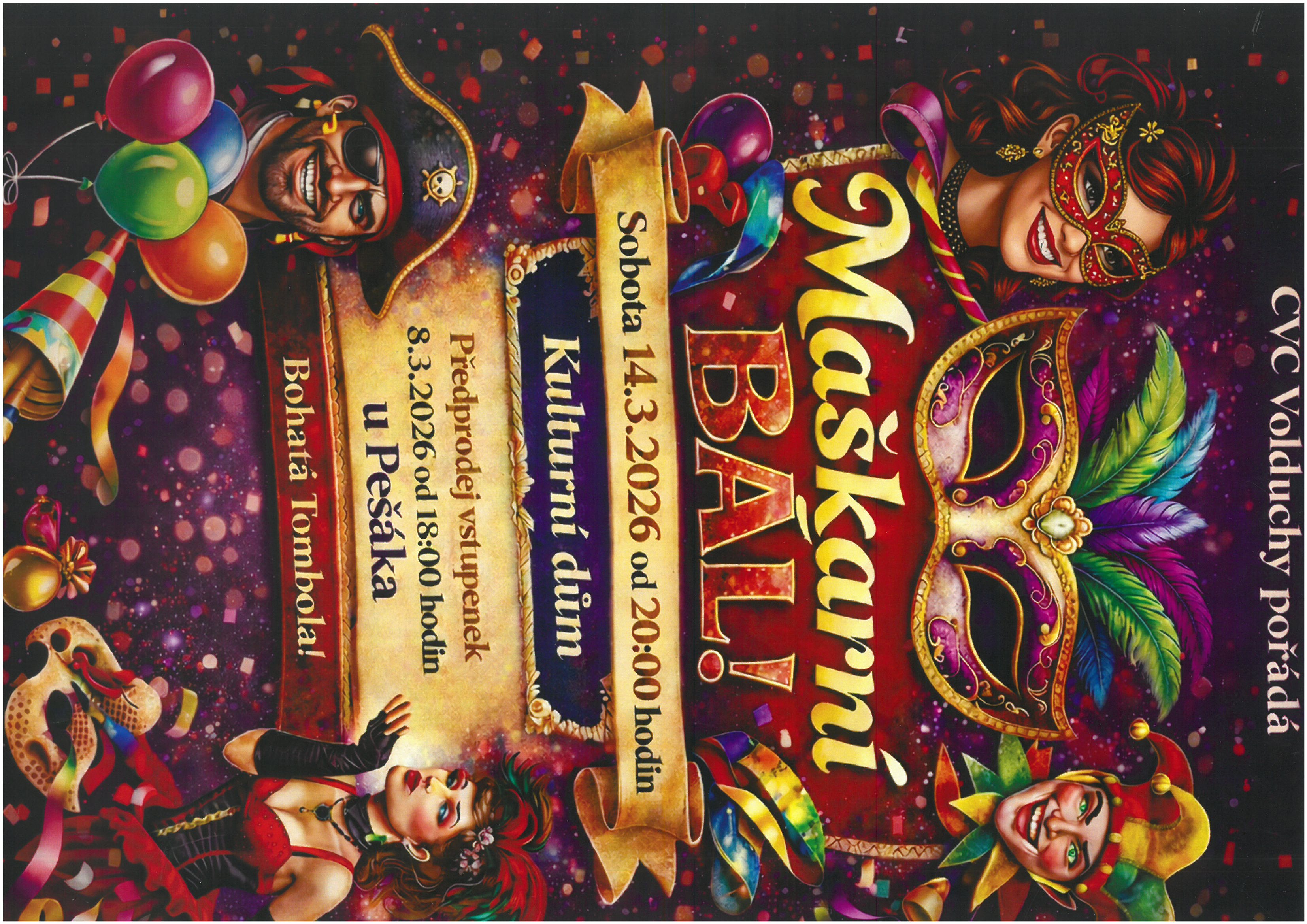 Cyklo veteran club Volduchy vás srdečně zve na maškarní bál, který se uskuteční v sobotu 14.3.2026 od 20.00 hodin v sále KD Volduchy. Čeká vás, ostatně jako vždy, dobrá zábava a bohatá tombola. Předprodej vstupenek proběhne v neděli 8.3.2026 od 18.00 hodin "U Pešáka".