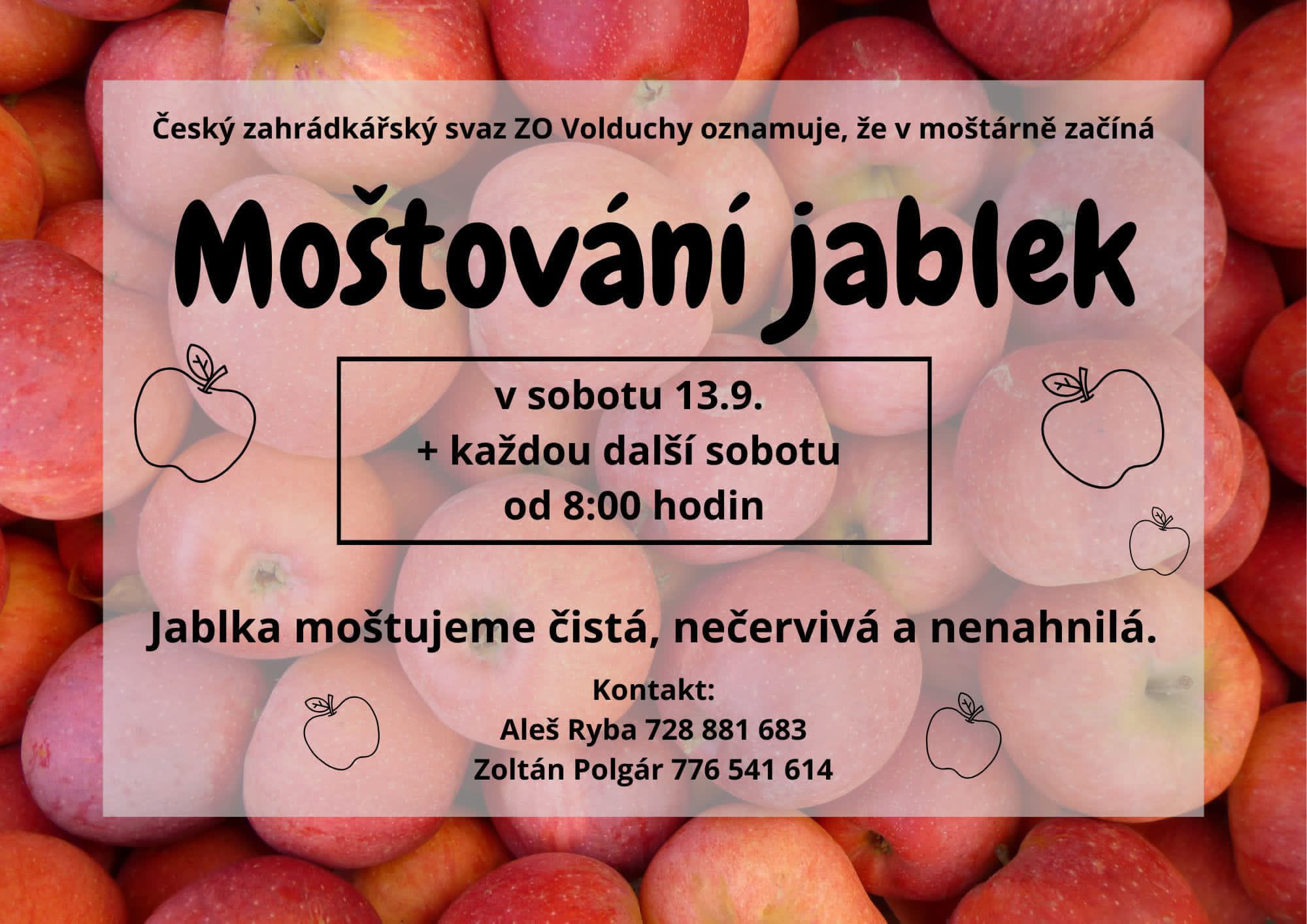 Český zahrádkářský svaz ZO Volduchy oznamuje, že v moštárně ve Volduchách začíná v sobotu 13.9.2025 od 8.00 hodin moštování jablek. Moštování bude od tohoto termínu probíhat vždy každou sobotu od 8.00 hodin - ukončení moštování bude oznámeno.